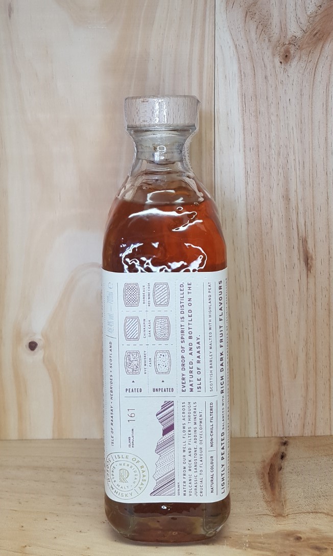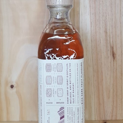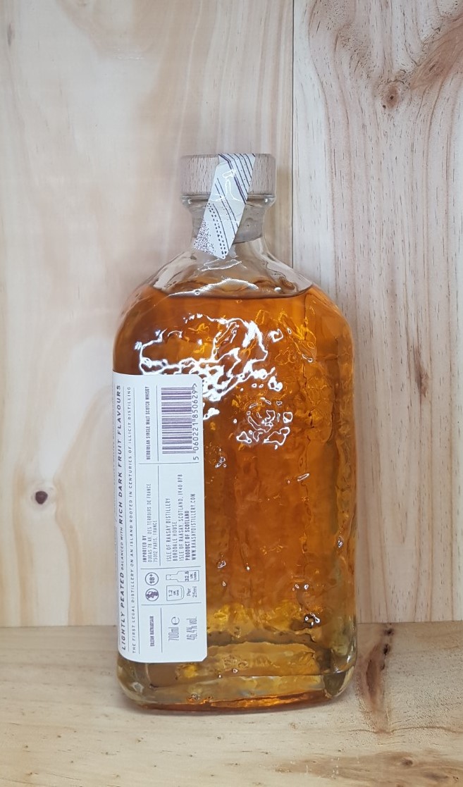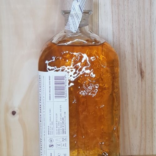 –Elaboration : Single malt issu d’un assemblage de whisky non-tourbés et tourbés 6 ppm. Vieillissement en fûts de chêne américain (seigle et chinkapin) et fût de vin rouge bordelais.