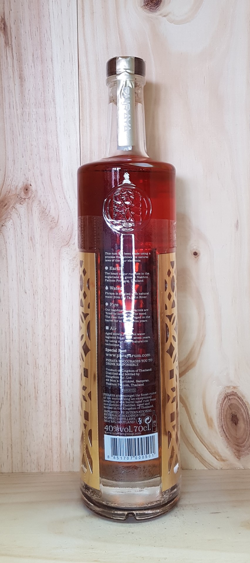 –Elaboration : Assemblage de rhums de 7 à 12 ans en fûts de Bourbon, distillés dans des alambics à colonne.